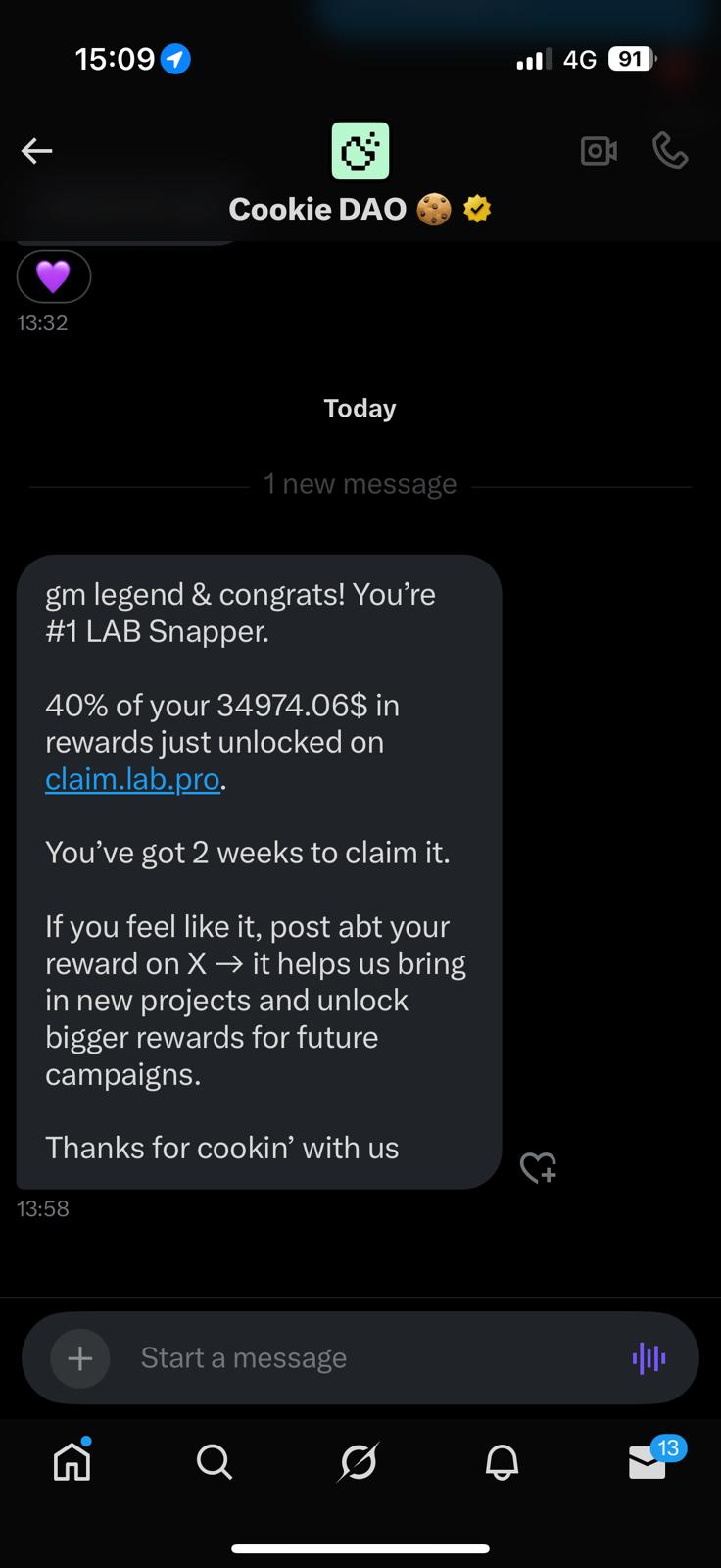 Receipt: ranked #1 LAB Snapper on Cookie (screenshot below).